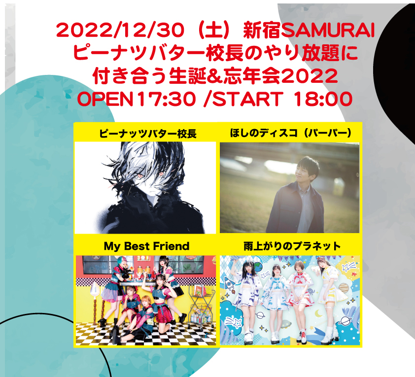 心響Music Entertainmentの忘年会&プロデューサーピーナッツバター校長の生誕ライブです。 ゲストにお笑い芸人のほしのディスコさんをお迎えしています。